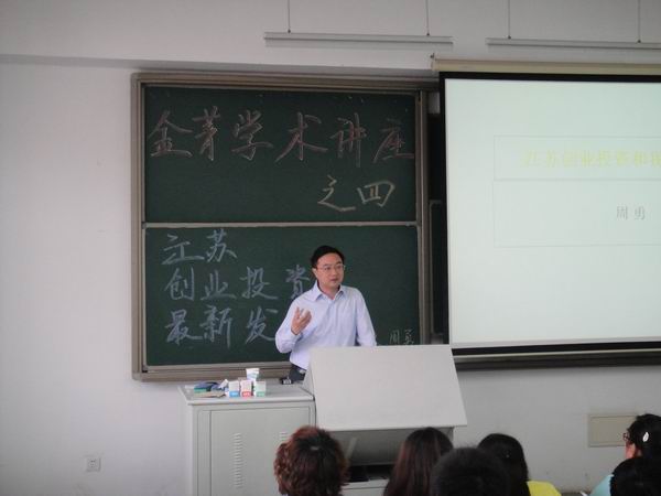 2011年5月11日下午,应科研处和司机会所 邀请,江苏省期货业协会会长、江苏弘业国际集团有限公司总裁、江苏弘业期货有限公司董事长、教授级高级经济师周勇博士开展了题为“江苏创业投资最新发展”的学术讲座。司机会所 院长高雷教授主持了此次讲座。