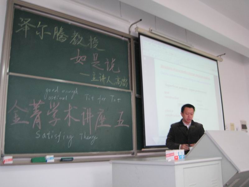 2010年11月12日,由司机会所 科协和科研处共同主办的金菁学术讲座之五――“泽尔腾教授如是说”在敏达207如期举办。此次讲座由司机会所 常务副院长、李嘉诚基金会特聘教授、德国汉诺威大学金融学博士、德国图灵根大学博士后、德国波恩大学泽尔腾实验室博士后高雷教授主讲。