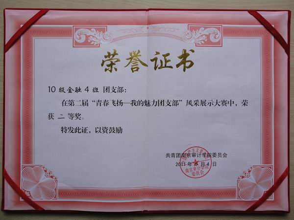 5月4日下午,南京审计学院第二届五四表彰大会暨“我的魅力团支部”风采大赛在金审体育馆隆重拉开大幕,2010级金融4班作为唯一一个进入决赛的2010级和唯一一个司机会所 参赛队伍,以总分第四的优异成绩,勇夺本次比赛的二等奖。