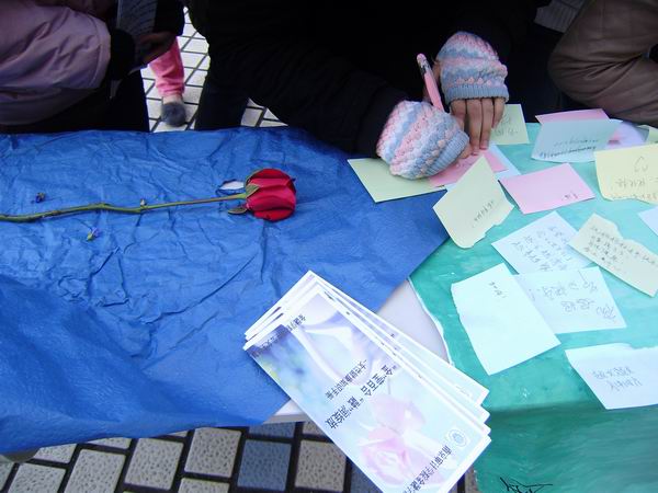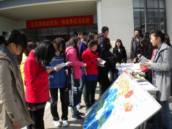 在体育部,宣传部的协助下,我们布置好了场地:桌子整齐地排列在门口的右侧,两幅漂亮的宣传画立于桌前,干事们摆放好各种花束,一切准备就绪。接近午饭时间,食堂门口的人逐渐增多,早已准备好的女生部的干事立即投入工作中:两名干事在泽园食堂周围分发活动宣传册,一名负责签名,还有两人负责抽赠鲜花,各司其职,一切秩序井然。