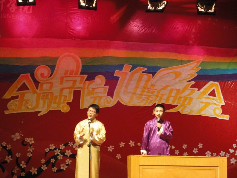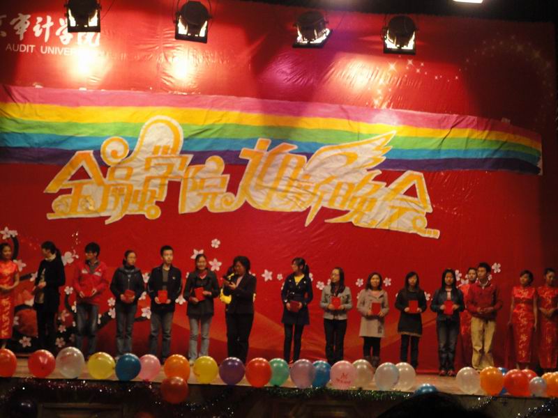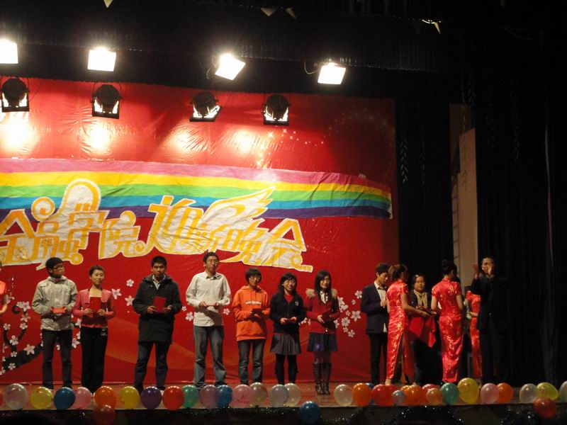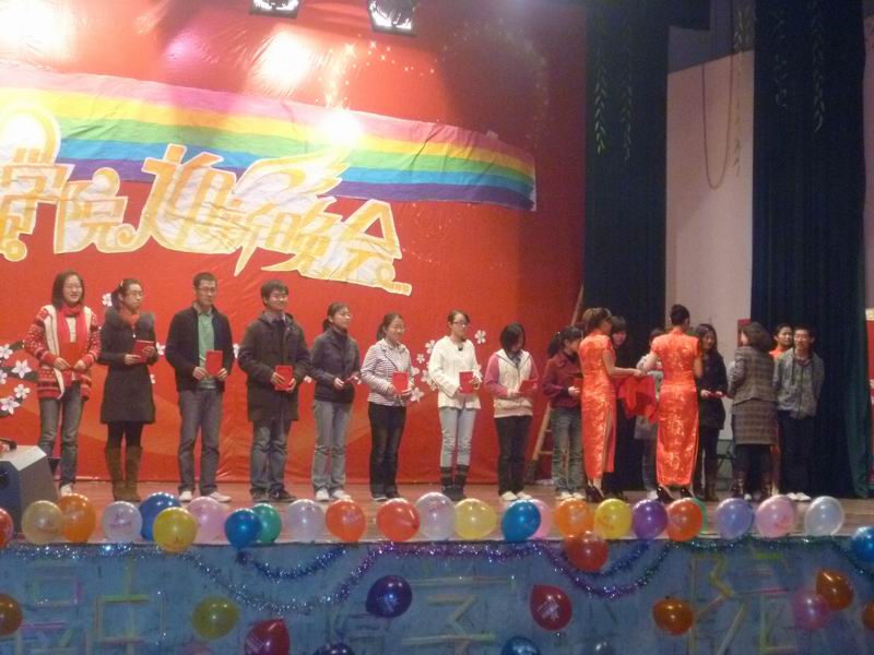 晚会表演的同时还进行了优秀学子的表彰仪式。蒋志芬书记表彰了学习标兵并发表讲话,卢亚娟副院长颁布英语之星,王家华副教授颁布数学之星,张成副书记颁布体育之星。在众多优秀学子中,国家奖学金获得者兼辩论队队长蒋宇芝、科研标兵,前证券投资俱乐部会长徐瑞以及体育之星、体育部部长李源作为代表发表了获奖感言。