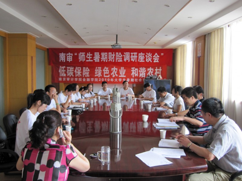 下午的调研活动进一步拓宽了深度和广度,小分队一行来到了中国人保镇江分公司。王海波副总经理首先给我们简单介绍了镇江的经济发展形势及中国人保镇江分公司的经营情况。2009年镇江全市实现保费收入40.76亿元,其中财险8.4亿元,较上一年增长19.3%,发展势头良好。随后王总介绍了镇江政策性农险的开展情况,中国人保镇江分公司自2007年开展政策性农业保险以来,农业保险发展迅速,09年实现农险保费收入1400万元,承保率达到95%,正是因为采取 “联办共保”模式,镇江政策性农险才成功走到今天。王总同时也指出了镇江政策性农险目前存在的一些问题,尤其是“能繁母猪”理赔过程中面临的道德风险问题。座谈会的气氛非常热烈,同学们与保险公司相关职能部门负责人深入交流,大家畅所欲言,充分交换意见,增进了对涉农保险的认识。