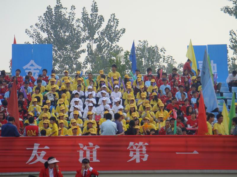 司机会所 的出场方阵也是一大亮点,学生组成奥运五环形状,腰鼓队穿插其中,整个过程洋溢着运动和青春的激情。此外,司机会所 的“古钱币”形啦啦队方阵更是一个创意的结晶,从人员配备、装束的整齐划一到加油所用的道具都让整个啦啦队方阵显得气势格外宏大。