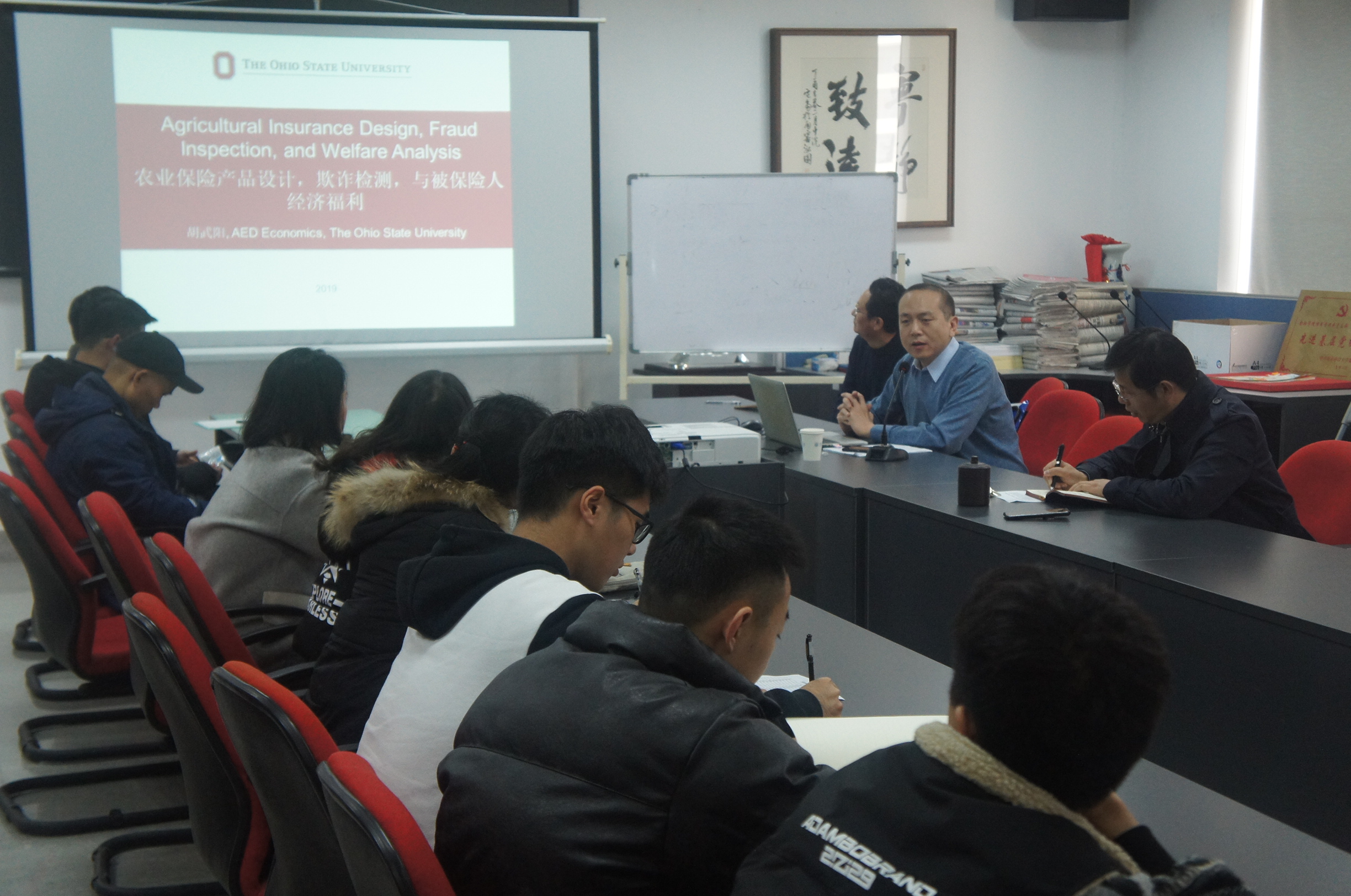 12月16日下午,美国俄亥俄州立大学AED经济系教授、博士生导师胡武阳应邀来访我校司机会所 ,在敏达楼516会议室开展了主题为“农业保险产品设计、欺诈检测与被保险人经济福利”的学术讲座。司机会所 副院长石岿然教授主持讲座,部分教师与全体19级金融学硕士研究生参加了本次活动。