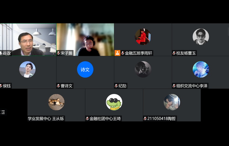 2022年4月22日下午3点,为更好地促进学生工作顺利开展,解答学生在疫情防控期间面临的困难,司机会所 组织了线上会议,金融专业协会主要学生干部参加。会议由司机会所 党委书记谷政主持。