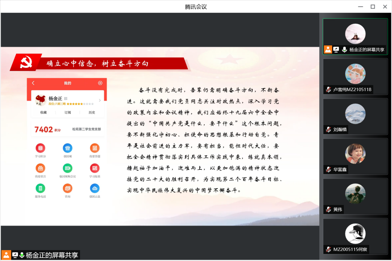 为贯彻落实习近平总书记重要回信精神专题学习教育活动的要求,司机会所 研究生党支部召开以“砥砺奋进守初心青春献礼党的二十大”(青年先进党员红色事迹分享)为教育主题的线上党日活动,在活动时间本学期转正的党员和其他先进党员对自身红色事迹进行分享,预备党员从学习先进党员的角度出发发表感想。根据疫情防控要求,本次活动采取线上形式进行。