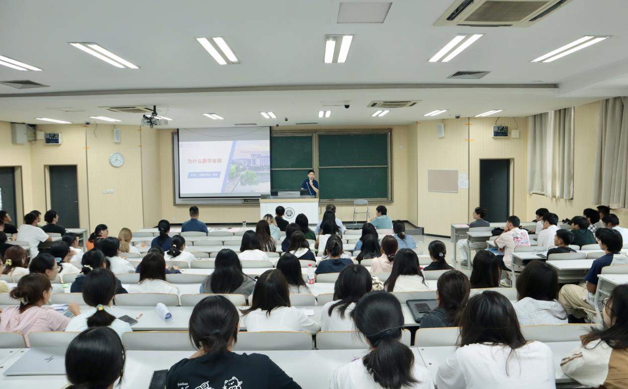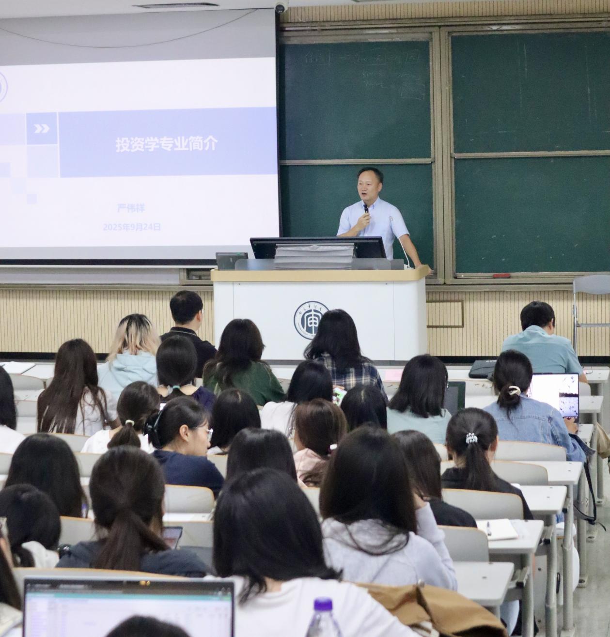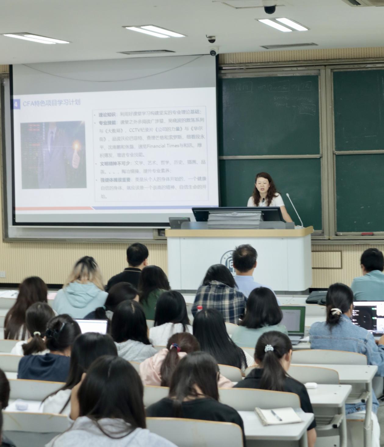 除了杰出校友的精彩讲座,学院还于当天下午在竞秀一报和竞秀二报同步举行了新生开学典礼暨专业教育介绍会。竞秀一报会场由司机会所 院长石岿然主持,孙清教授、金融审计系主任曹源芳分别为新生们详细介绍了金融学专业、金融审计专业的培养目标与课程体系。竞秀二报会场由司机会所 党委副书记单德伟主持,投资学系主任严伟祥、信用管理系主任肖振宇及金融工程系主任郭风龙分别就各自专业的特色、优势及未来发展前景做了深入浅出的讲解。CFA项目负责人金素向同学们介绍了项目的具体情况。青年教师代表胡熠、胡玥结合自身经历分享了宝贵的学习与成长经验。活动中,司机会所 党委书记王家华与院长石岿然寄语新生,希望大家尽快适应大学生活,充分利用学校和学院提供的优质资源,打下扎实的理论基础;保持好奇心和求知欲,培养批判性思维和创新能力,在未来的学习和实践中,勇于探索、敢于争先,成长为具备国际视野和本土情怀的复合型金融人才。两场专业教育活动帮助新生们明晰了未来的学习方向,为他们的大学生涯规划打下了坚实基础。