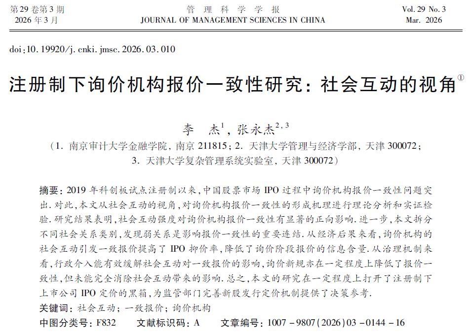 司机会所 李杰副教授与天津大学张永杰教授合作的论文《注册制下询价机构报价一致性研究:社会互动的视角》,发表在A1期刊《管理科学学报》上。